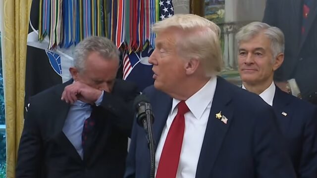 Robert F. Kennedy Jr. parecía hacer una bolsa de nicotina mientras pretendía ser tos durante un anuncio en la Oficina Oval el martes.
