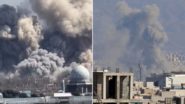 La famosa Torre Azadi de Teherán se puede ver en el centro de un vídeo mientras la capital iraní es bombardeada.