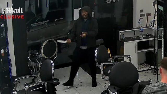 Imágenes de CCTV obtenidas exclusivamente por el Daily Mail muestran a un hombre con un cuchillo entrando a una lujosa barbería en Peterborough, Cambridgeshire, el viernes.