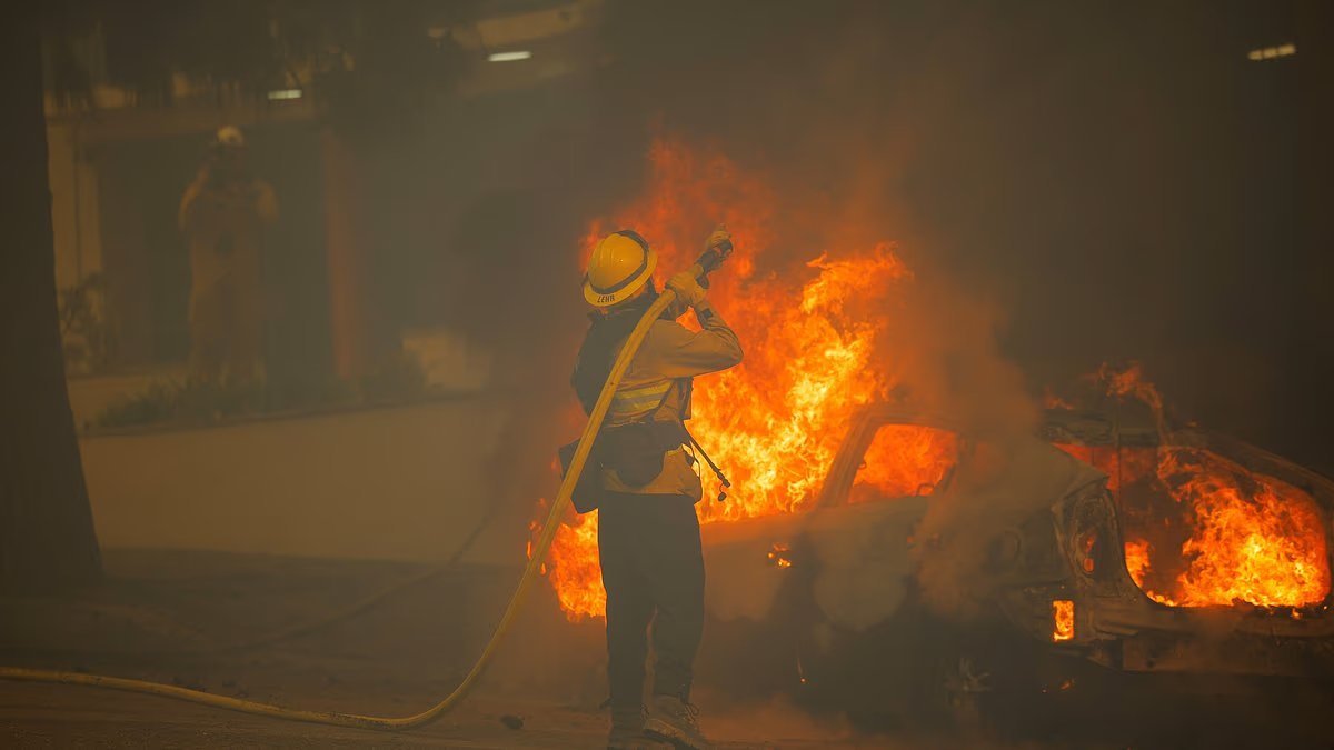 Pacific Palisades, los bomberos corren mientras un incendio forestal arde en California