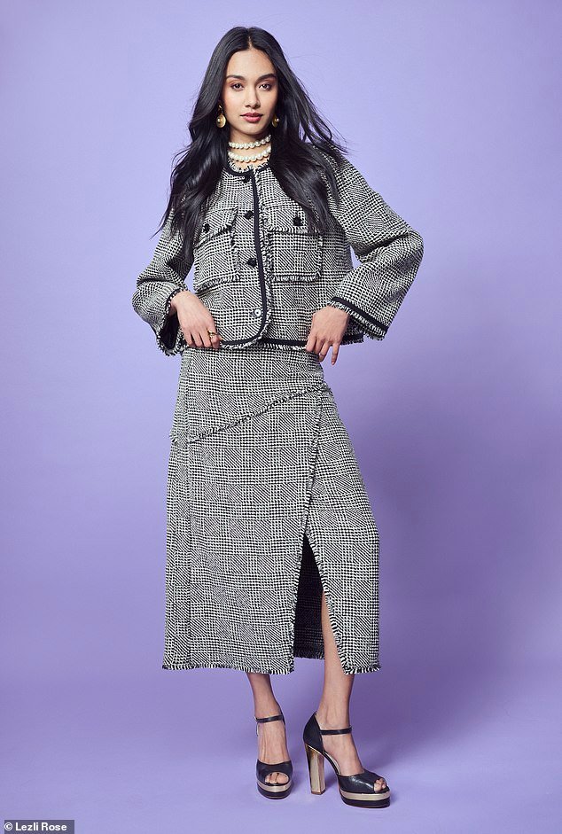 Chaqueta, £ 62, y faldas, £ 34, next.com.uk; Zapatos, £ 38, riversland.com; Pendientes, £ 125, PinkPiglateTocation.com