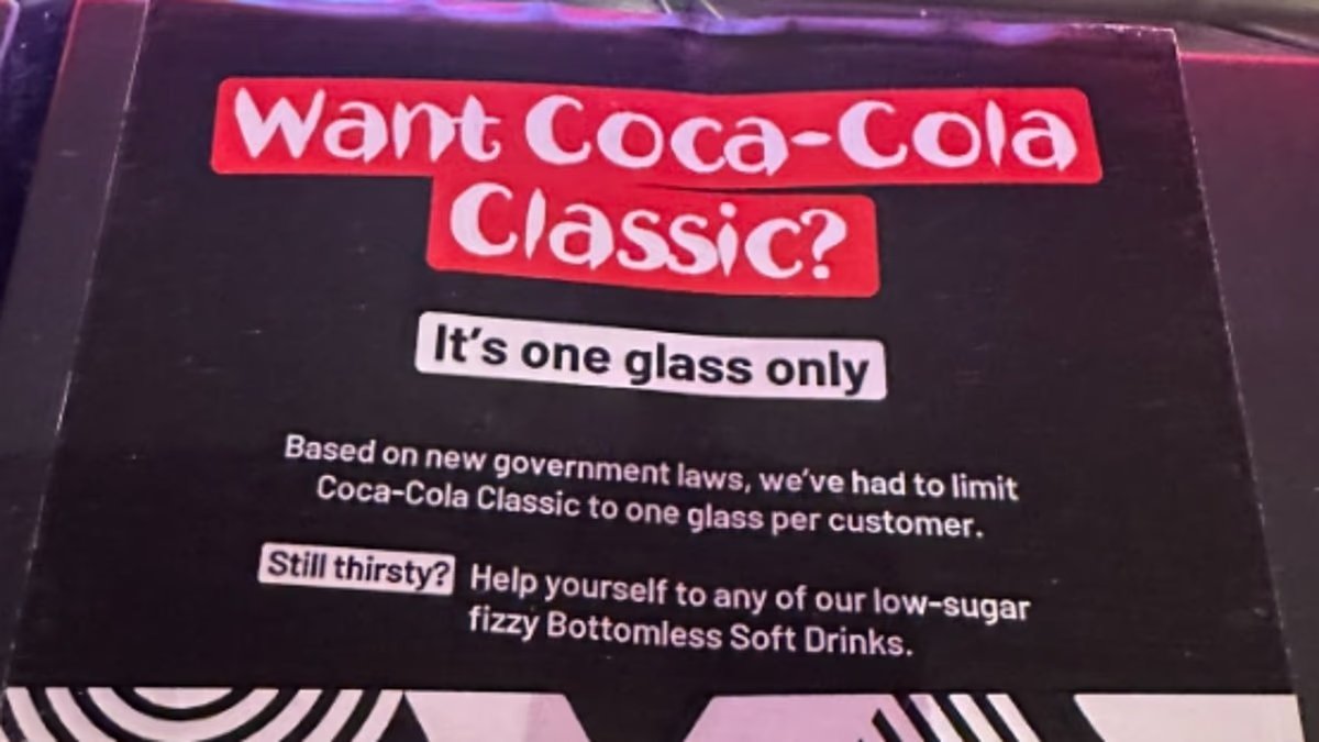 ‘Basado en la nueva ley gubernamental, tuvimos que restringir las clases de coca a un vaso por cliente. ¿Sin embargo, sed? Ayúdate en uno de nuestros refrescos de Fiji Botles cortos ‘