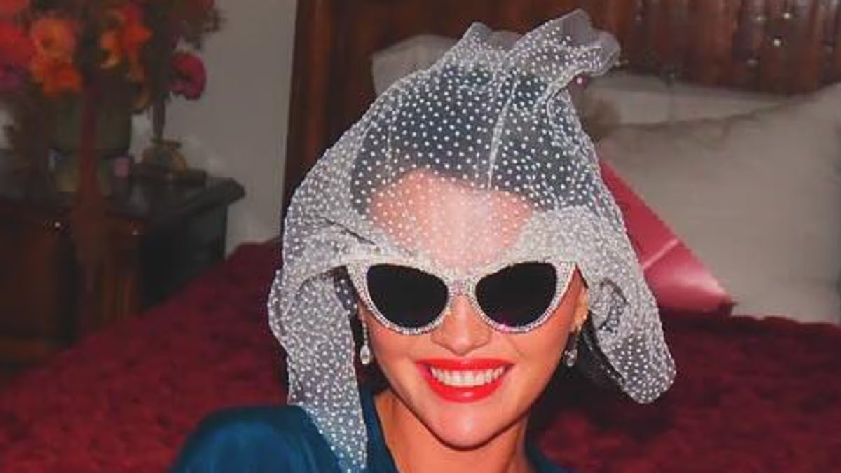 El fundador de Rare Beauty también provocó una sonrisa alegre mientras tocaba una bata de vestir de Ga Dark -Blue con un detalle de flores en otro chasquido.