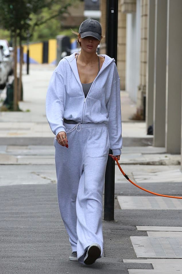 Olivia llevaba una pista de pistas gris claro de repente vestido con una gorra de béisbol y combinada con cómodos entrenadores