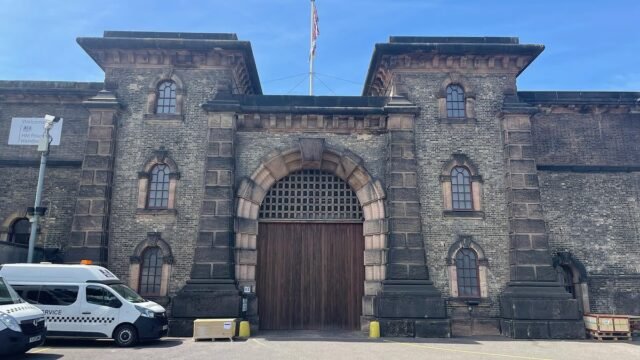 La prisión victoriana, con su entrada de madera de doble cara bajo un arco gótico, está flanqueada por torres gemelas de tres pisos. Todo el complejo parecido a una fortaleza está rodeado por muros de 30 pies, algunos de los cuales están rematados con alambre de púas afilado y vallas metálicas.