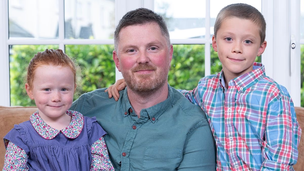 Aled Edwards, de Bangor, Gales del Norte, con sus hijos Sullivan, de 7 años, y Bea, de 4