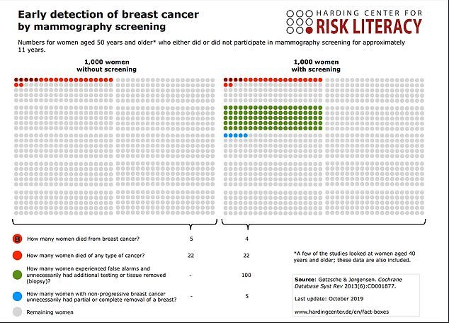 Muestra que por cada mil mujeres que pasen por la detección de senos, cuatro aún morirán en el cáncer de seno y 18 se infectarán con otros tipos de cáncer. Se pueden diagnosticar primero, lo que significa que tienen un diagnóstico de cáncer durante mucho tiempo. Sin embargo, esto no significa que vivirán más.