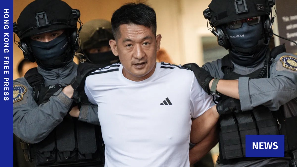 El empresario fue escoltado desde la comisaría del aeropuerto por policías tailandeses armados y enmascarados con las manos atadas a la espalda, una práctica inusual para los funcionarios locales.