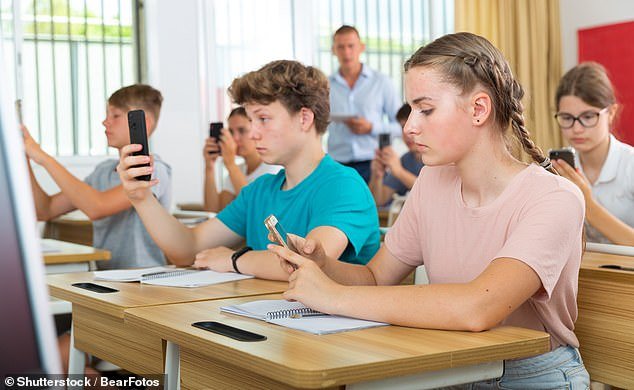 Un nuevo estudio ha dado agua fría sobre este concepto de que los teléfonos en las escuelas son beneficiosos para los niños porque no muestra ninguna conexión entre restricciones y mejores calificaciones o una mejor salud mental (imagen de stock)