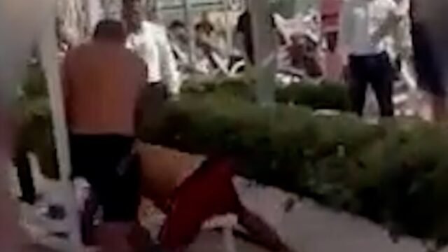 Las imágenes impactantes muestran que los turistas están gritando cuando la pelea está fuera de control, el video muestra que el puño está volando ante la piscina de Cystino antes de Sieortino.