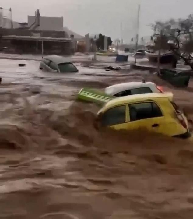 Las fuertes lluvias en las ciudades de vacaciones de la isla y náusar causaron inundación de inundaciones que se extendieron en las calles, transportando automóviles y ruinas, los edificios de lavado blanco cruzados.