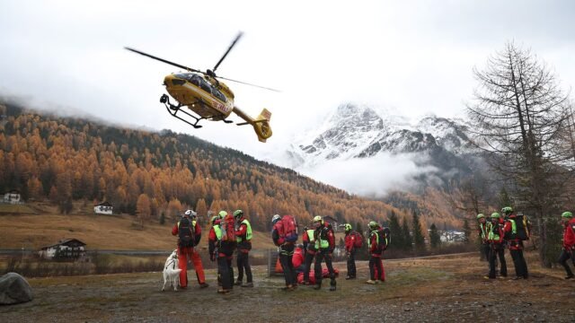 Un helicóptero de rescate de montaña sobrevuela las montañas nevadas de Ortler en busca de escaladores desaparecidos tras una avalancha.