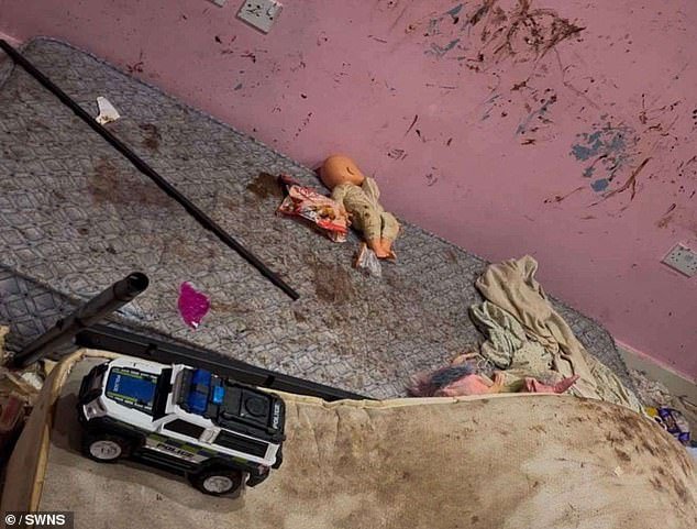Las fotos revelan escenas enfermas de envoltura de comida que se extienden por el piso, los juguetes se sacuden en charcos sucios y una muñeca se deja en un colchón manchado, rodeado por un paquete de desayuno vacío y un marco de cama roto.
