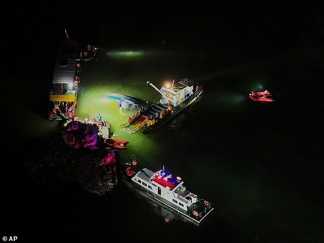 Tres personas murieron después de dos barcos espectaculares que transportaban turistas volcados en China y tres faltaban. Ilustrado: los salvadores están llevando a cabo operaciones de búsqueda y rescate donde dos pasajeros han volcado el bote en la ciudad de Kianci