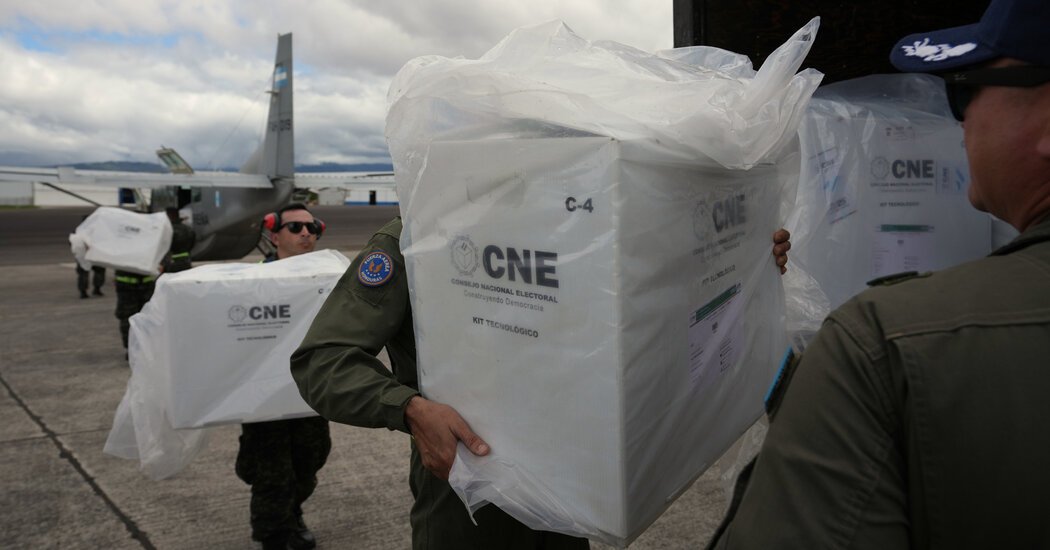 En una oficina del CNE en Tegucigalpa, la capital de Honduras, el lunes por la noche, trabajadores electorales y personal militar descargaron cajas selladas de camiones mientras un hombre con un megáfono llamaba a sus respectivos números. Las cajas estaban cerradas con cinta adhesiva y etiquetadas con el lema “Construyendo la democracia”.