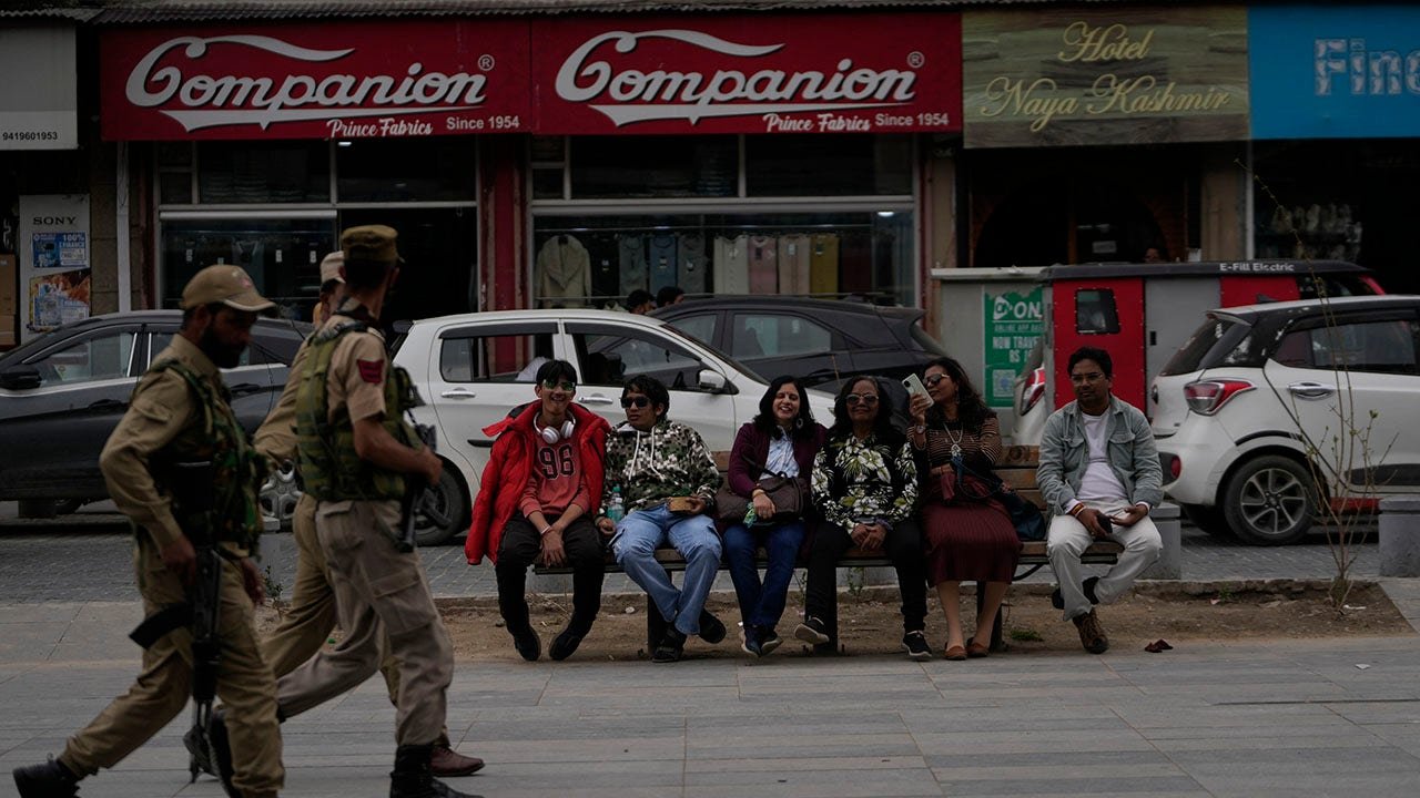 Los turistas indios descansaron en un banco el martes 22 de abril de 2025 en una torre de reloj en Srinagar, Cachemira controlada por la India. (AP Photos/Eat Mukhtar)
