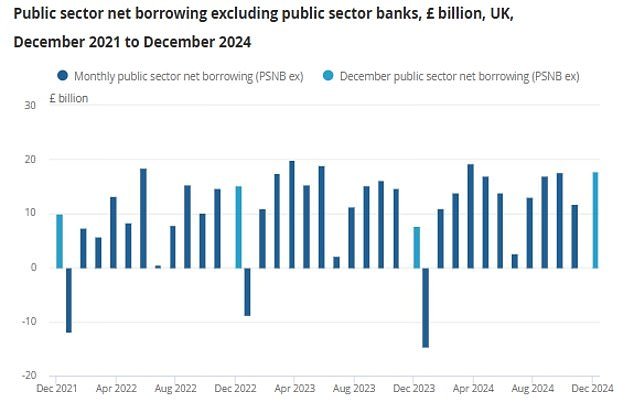 La subdirectora de Finanzas del Sector Público de la ONS, Jessica Barnaby, dijo: ‘Con casi 18 mil millones de libras esterlinas, el endeudamiento del mes pasado fue el tercero más alto de cualquier diciembre registrado.