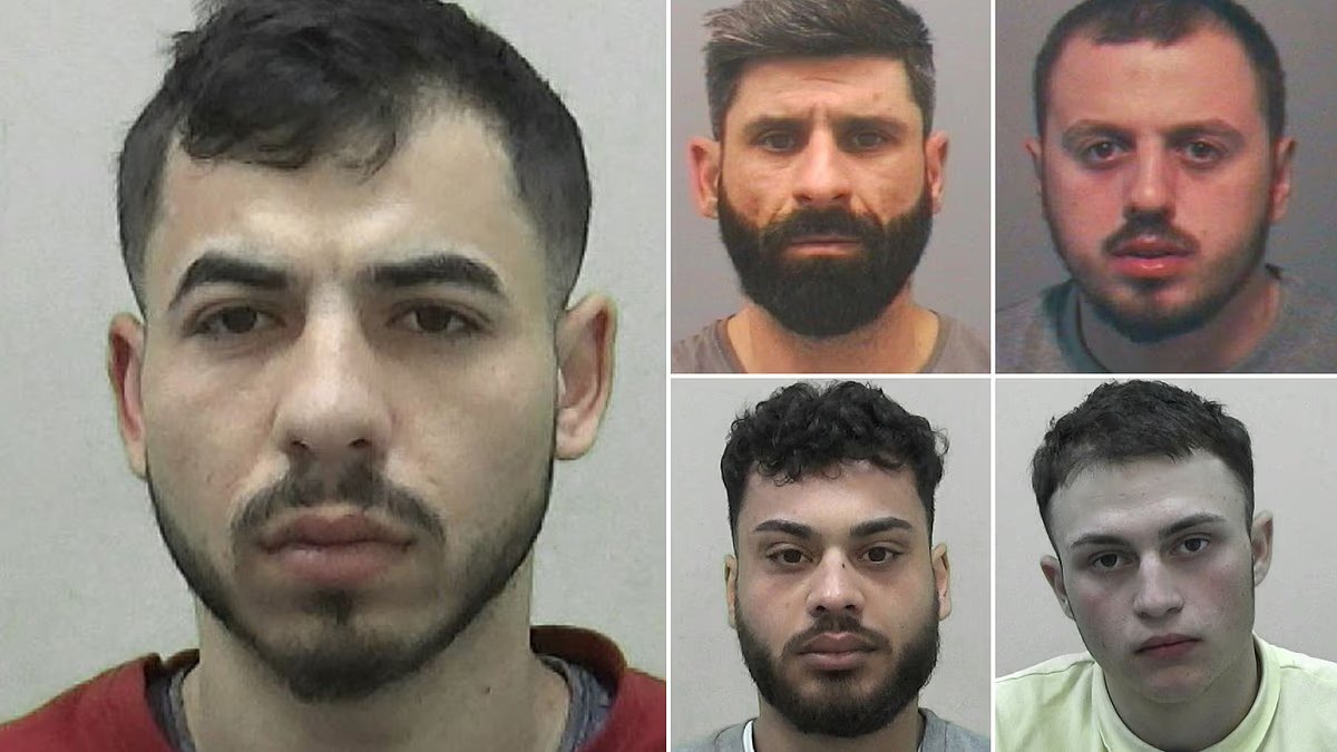 Codrin Dura, de 27 años, Leonard Paun, de 24, Stefan Ciuraru, de 23, Bogdan Gugiuman, de 44, y Klaudio Aleksiu, de 28, todos rumanos o albaneses, fueron condenados por delitos sexuales graves contra un total de seis adolescentes.