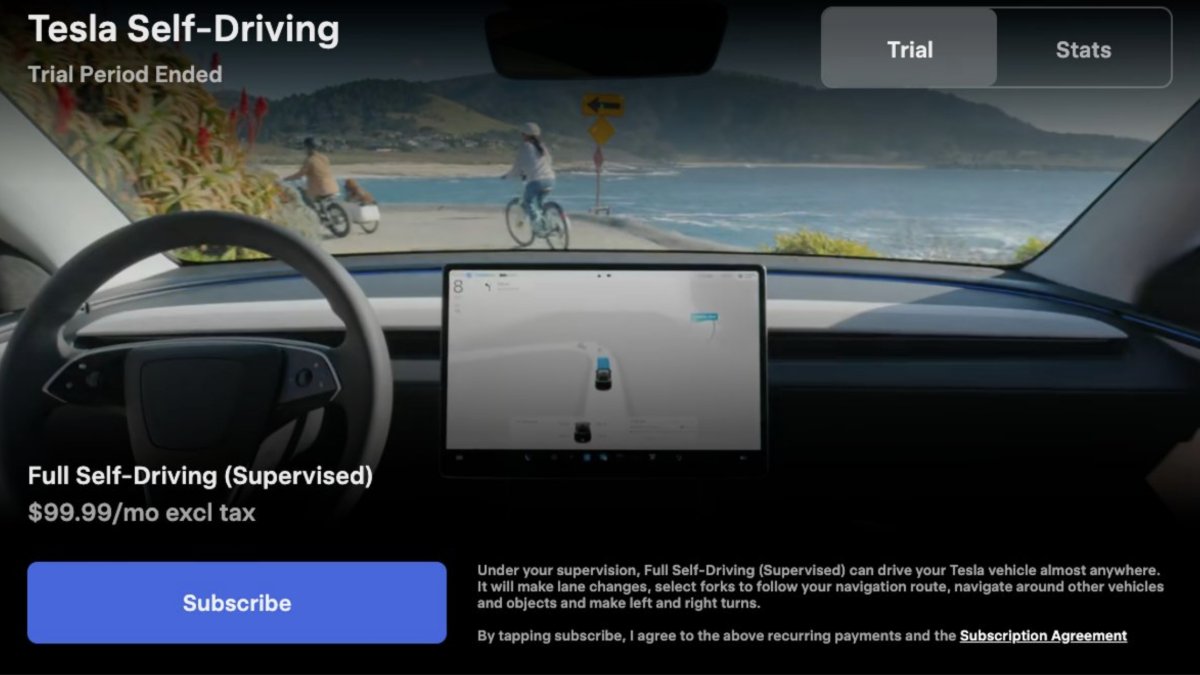 Las nuevas funciones incluyen una nueva aplicación de conducción autónoma que facilita la suscripción al paquete completo de conducción autónoma (supervisada) de la empresa con un solo toque. Recientemente, FSD dejó de estar disponible como compra independiente y ahora solo está disponible como una suscripción de $99,99 al mes.
