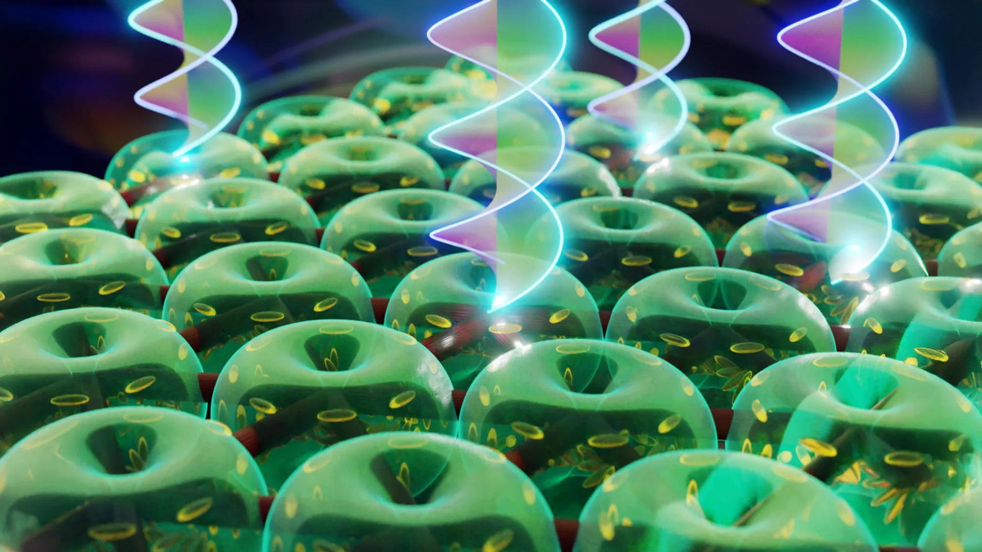 Dentro de este material se pueden formar defectos especiales conocidos como torones. “Se pueden imaginar como espirales muy retorcidas, como el ADN, con moléculas de cristal líquido dispuestas en ellas. Si se cierra una espiral de este tipo uniendo sus extremos en un anillo en forma de donut, se obtiene un torón”, explica Medrzyca. “Estas estructuras actúan como trampas microscópicas para la luz. Un paso clave fue equiparar los fotones con un campo magnético. Aunque la luz no responde a los campos magnéticos como lo hacen los electrones, se puede lograr un comportamiento similar para la luz de otras maneras”.