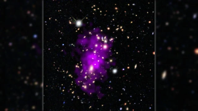 Los astrónomos identificaron por primera vez este cúmulo de galaxias el 31 de diciembre de 2020. En esa fecha, la apariencia burbujeante del cúmulo y el gas sobrecalentado detectado por la Luna (que se muestra en violeta) llevaron a los investigadores a darle el memorable apodo de “Cúmulo de Champán” en lugar de su nombre oficial. J130558.9+263048.4.