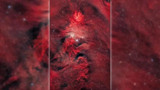 En la parte superior de esta escena repleta de estrellas se encuentra la Nebulosa del Cono, una alta estructura de gas y polvo alimentada por la poderosa radiación de estrellas jóvenes cercanas. Debajo se extiende una nube enredada y brillante llamada Nebulosa Piel de Zorro, llamada así por su apariencia texturizada y parecida a una piel. Estas características se remodelan constantemente a medida que la enérgica luz de las estrellas impacta y esculpe el material circundante.