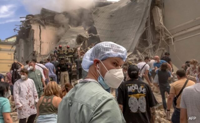 Los bloques de apartamentos fueron alcanzados y el banco central de Ucrania dijo que uno de sus edificios en el centro de la ciudad resultó dañado en el ataque.