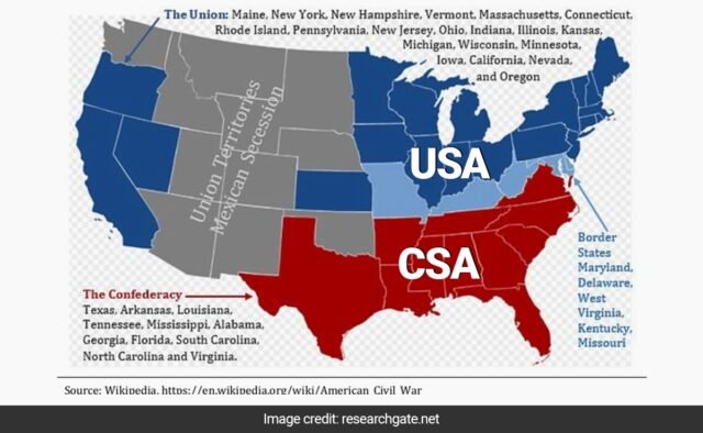 Pero exactamente 130 años antes de eso, en 1861, otra superpotencia -la “democracia más antigua del mundo” -los Estados Unidos de América- entonces una unión de sólo 34 estados, no 50 como lo es hoy- colapsó, dividiéndose en dos países -los Estados Unidos-. Estados Unidos de América y los Estados Confederados de América, lo que deja a Estados Unidos con menos de una cuarta parte del tamaño que conocemos hoy. Esto continuó durante unos cinco años, durante los cuales estalló una guerra total entre los dos países. Esa guerra fue conocida como la Guerra Civil Estadounidense.