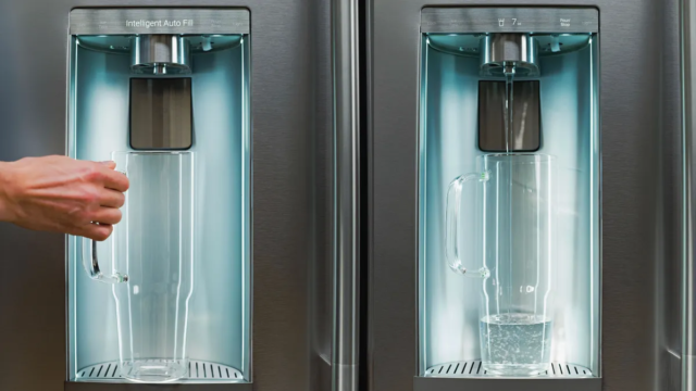Los refrigeradores son cada vez más inteligentes y también tienen manchas de agua. Hemos visto varios refrigeradores, incluidos GE y KitchenAid, que tienen tecnología inteligente AutoFill que utiliza una cámara o un sensor de peso para determinar exactamente con cuánta agua llenar una botella o un vaso. Cuando está lleno al 90%, el agua se corta, lo que le permite hacer otras cosas mientras continúa el llenado.