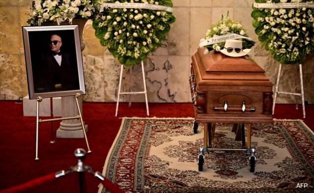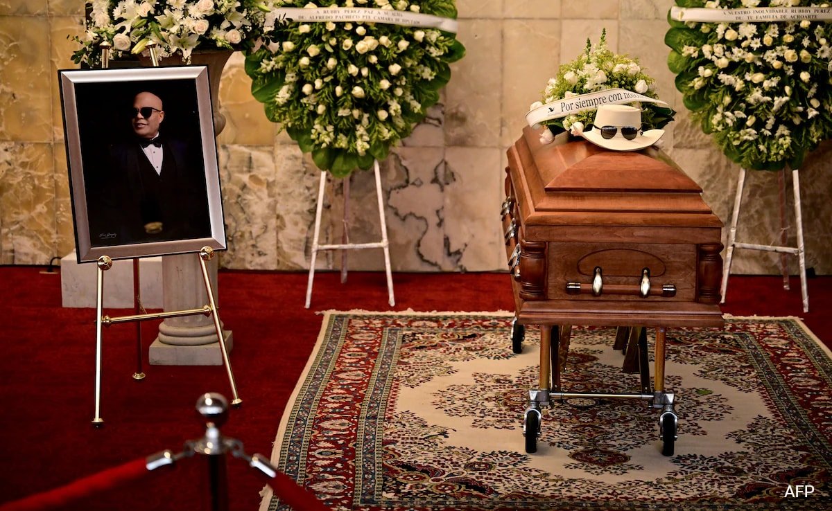 El ataúd de Pérez estaba rodeado de floral y la firma del artista estaba encima de sombrero y gafas.