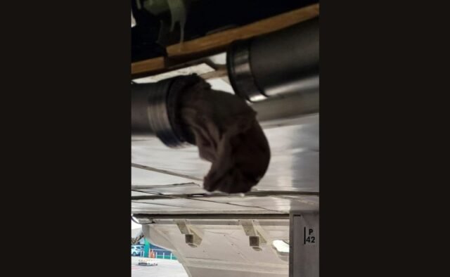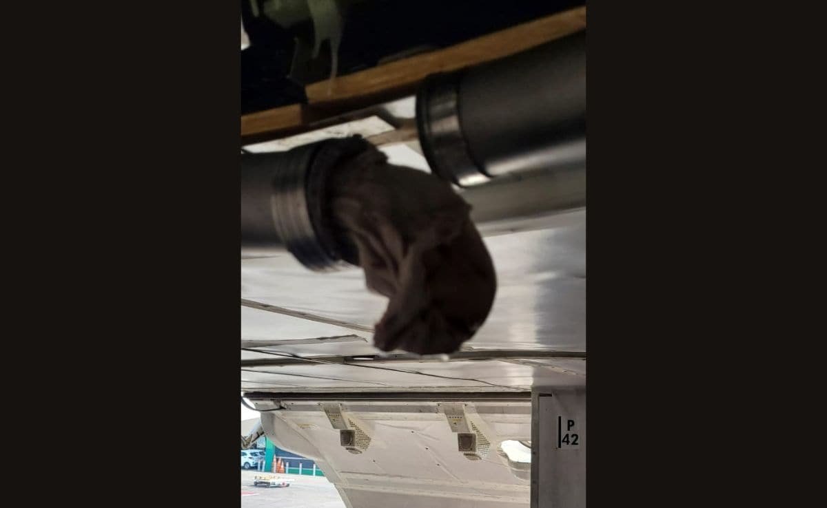 Una manta completa en una de las imágenes se está arrastrando desde el tubo de plomería del avión cuando una imagen final muestra una prenda de vestir en un tubo.