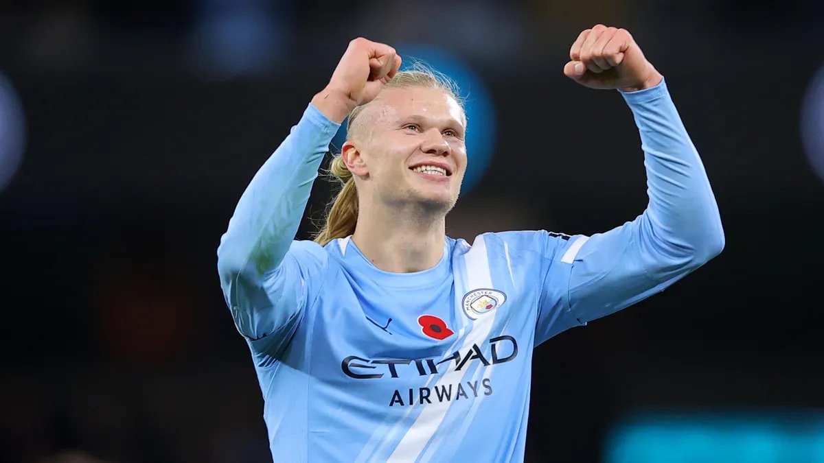Erling Haaland, del Manchester City, celebra con ambos puños en alto y sonriendo.
