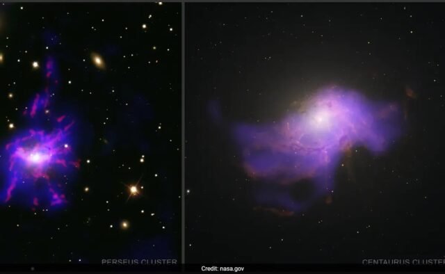 Perseo Cluster: el gas caliente parece violeta azul con filamentos rosados ​​fuertes, mientras que las galaxias circundantes brillan brillantemente.