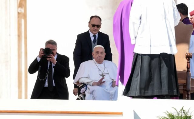 El domingo, el Papa Francisco apareció por primera vez públicamente después de ser dado de alta del hospital después del tratamiento de la neumonía doble hace dos semanas, ingresó a St. Peters Square en silla de ruedas para dar la bienvenida a la multitud.