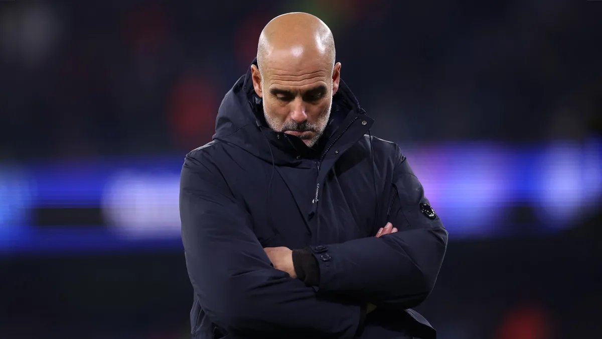 Pep Guardiola, entrenador del Manchester City, mira hacia abajo con los brazos cruzados.