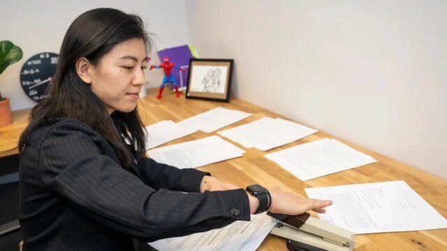 Violet Han usa una grapadora unida a una plataforma controlada por un modelo de IA.