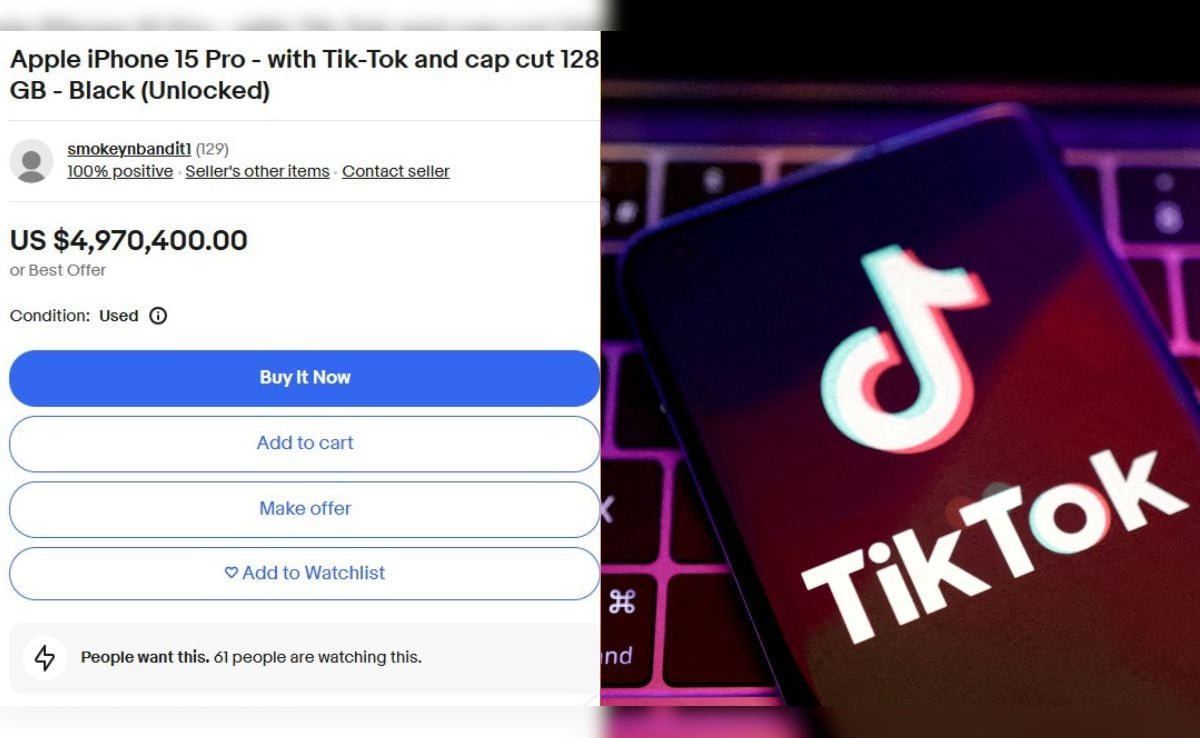 Un informe dijo New York PostUn iPhone con Tiktok que todavía está instalado está listado en aproximadamente $ 5 millones (43 millones de rupias). Ebay. “El protector de pantalla solo tiene el teléfono dañino es perfecto y Tiktok”, se lee en un iPhone 15 Pro, detalles del anuncio modelo de 128 GB.