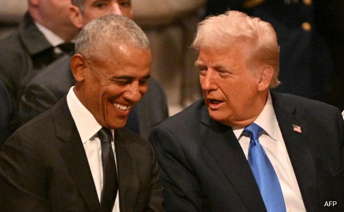 Se ve al presidente electo Donald Trump y al expresidente Barack Obama entablando una conversación amistosa en el funeral del presidente Jimmy Carter el 9 de enero de 2025.