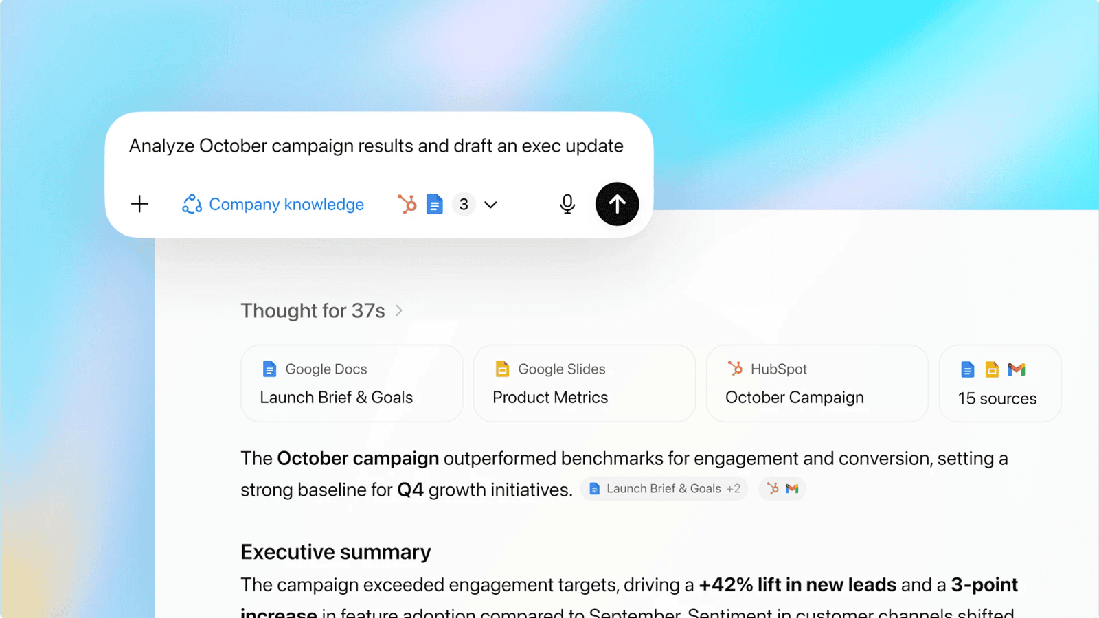 Por ejemplo, ChatGPT ahora puede crear una sesión informativa para el cliente utilizando mensajes recientes de Slack, notas de Google Docs y actualizaciones de tickets de soporte en Intercom. Por lo tanto, los equipos ya no tienen que desplazarse manualmente por archivos o correos electrónicos para preparar una actualización.