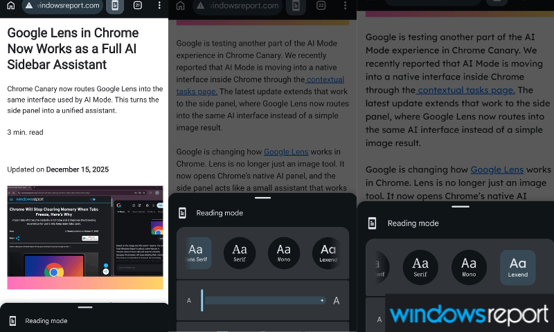 El modo de lectura ordena la página y muestra los artículos en un formato simple. En dispositivos móviles, actualmente ofrece un pequeño conjunto de opciones genéricas como sans, serif y mono. Lexend ahora aparece como una opción adicional con nombre en esa lista.