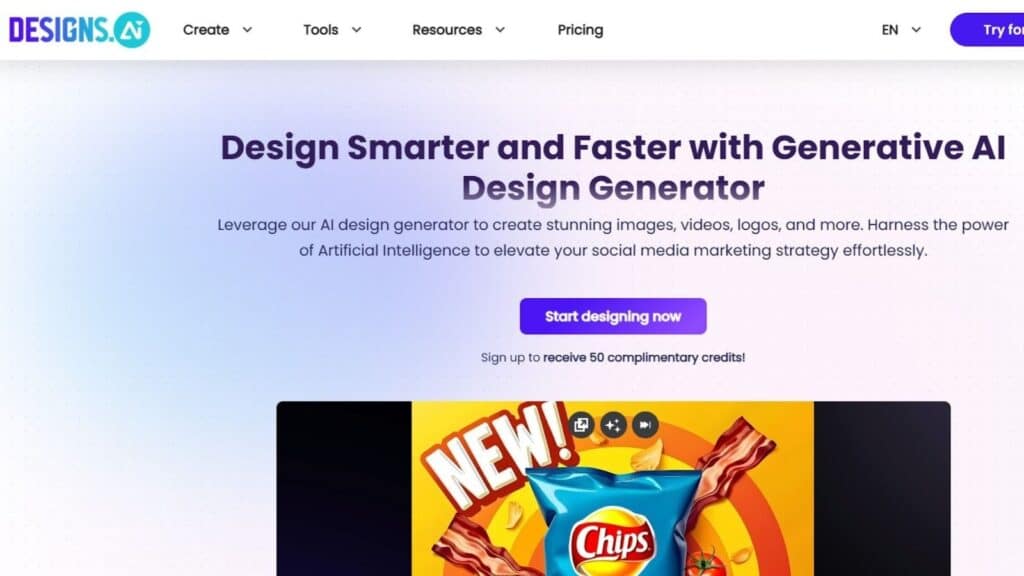 Designs.ai ofrece un conjunto creativo de múltiples herramientas que incluye logotipos, videos, materiales de marketing y más. Los usuarios de Windows que desean un espacio de trabajo unificado para una variedad de activos creativos encuentran práctica la plataforma. El generador de IA crea ideas modernas que se pueden perfeccionar con un editor optimizado.