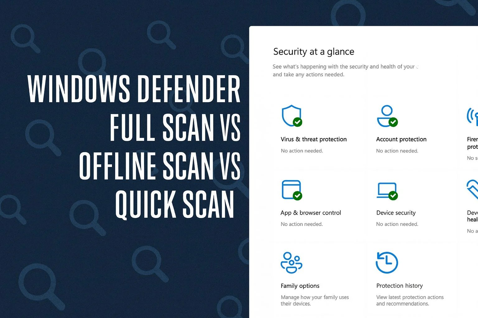 Cada modo de escaneo maneja diferentes requisitos de seguridad. Un análisis rápido comprueba las ubicaciones de amenazas comunes, un análisis completo revisa todo el sistema y un análisis fuera de línea apunta al malware profundo o persistente. Si desea comprender mejor las herramientas de seguridad, consulte esta descripción general de la configuración de Windows Defender para obtener claridad sobre todas las características principales.