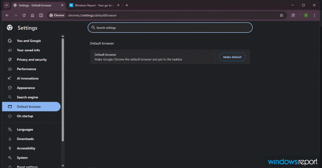 La tercera variación aparece dentro de la página de configuración predeterminada del navegador Chrome en Windows. Chrome agrega una línea que invita al usuario a configurarlo como navegador predeterminado y agregarlo a la barra de tareas.