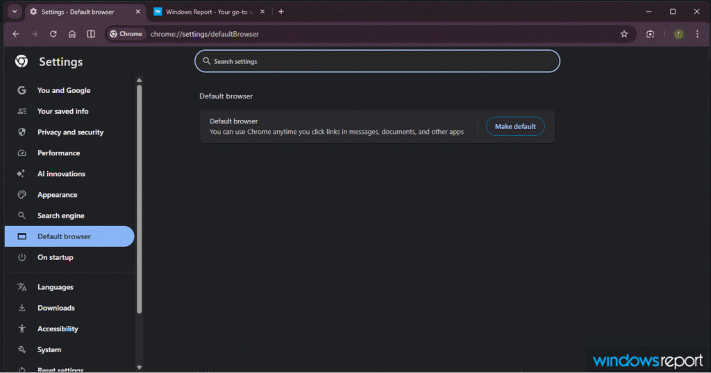 Una segunda variación ocurre cuando Chrome no es el predeterminado. Chrome agrega una línea corta que describe el propósito de un navegador predeterminado. Esto explica que el navegador predeterminado abre enlaces iniciados desde otras aplicaciones o componentes del sistema, como mensajes, documentos o notificaciones. Esto da una idea clara de por qué la elección predeterminada es importante.