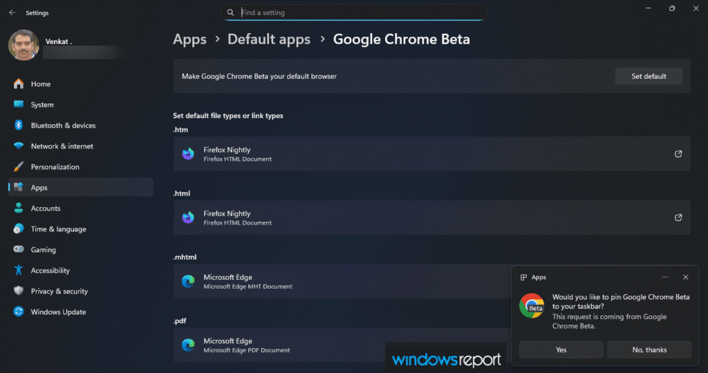 Cuando el usuario selecciona el botón Establecer como predeterminado, Windows abre la página de Aplicaciones predeterminadas para Chrome y muestra una notificación que pregunta si Chrome debe anclarse a la barra de tareas. Este comportamiento se observó por primera vez durante el desarrollo de funciones y ahora aparece en la versión beta de Chrome.