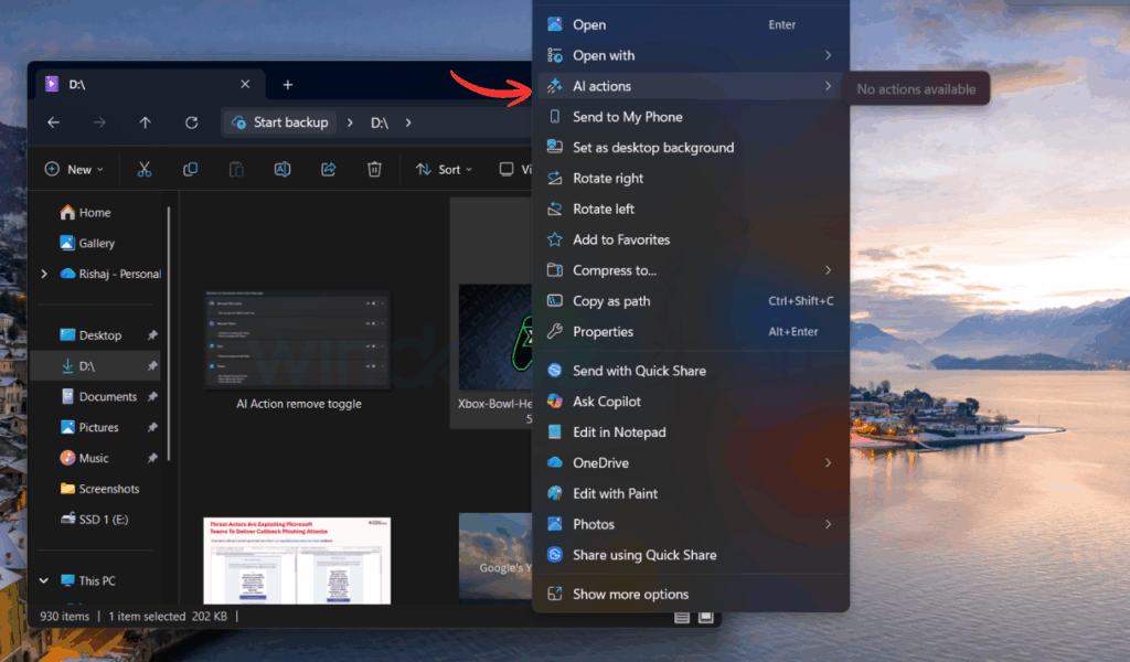 Pero, al igual que en la construcción anterior, Incluso cuando cierras estas aplicaciones, la etiqueta Acciones de IA permanece visible como una categoría fantasma en el menú contextual, sin hacer absolutamente nada más que ocupar espacio.. Hubiera sido mejor eliminar la opción por completo (y al mismo tiempo eliminar las acciones de IA para las aplicaciones) del menú contextual ya abarrotado. Puedes consultar la imagen a continuación: