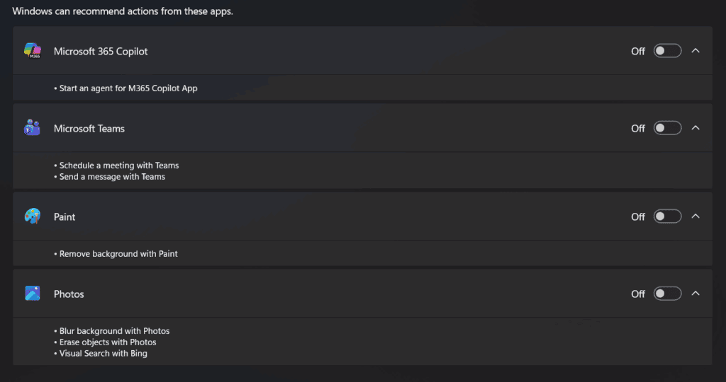En esta versión, las acciones de IA ya no se le imponen en el menú contextual del botón derecho. Si Windows no detecta ninguna acción de IA disponible o habilitada, toda la sección desaparece. como Visto por un usuario de RedditLa última versión te permite eliminar acciones simultáneas de IA dirigiéndote Configuración > Aplicaciones > Acciones. Desde esa página, puedes simplemente Desactiva aplicaciones como Paint, Photos o Teams.