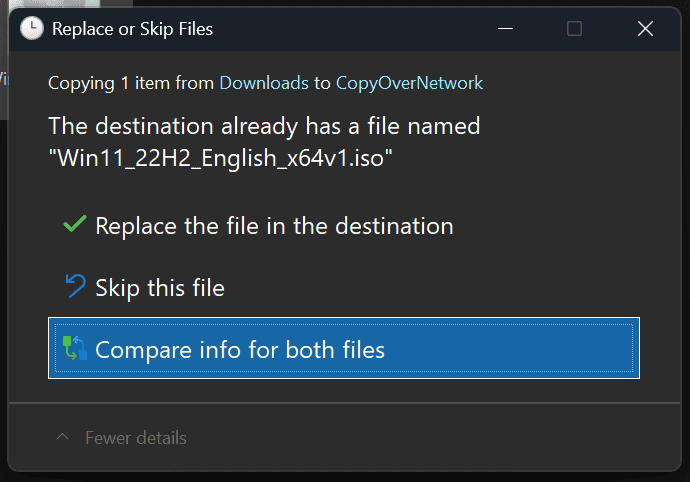 Microsoft File Explorer ha mejorado la experiencia del modo oscuro, copiar, ejecutar, eliminar y diálogo para que los verbos de confirmación ahora se mostrarán constantemente. La barra de progreso, las vistas de los gráficos y las ventanas emergentes de errores son armoniosas bajo un solo tema para todo el flujo visual más limpio.